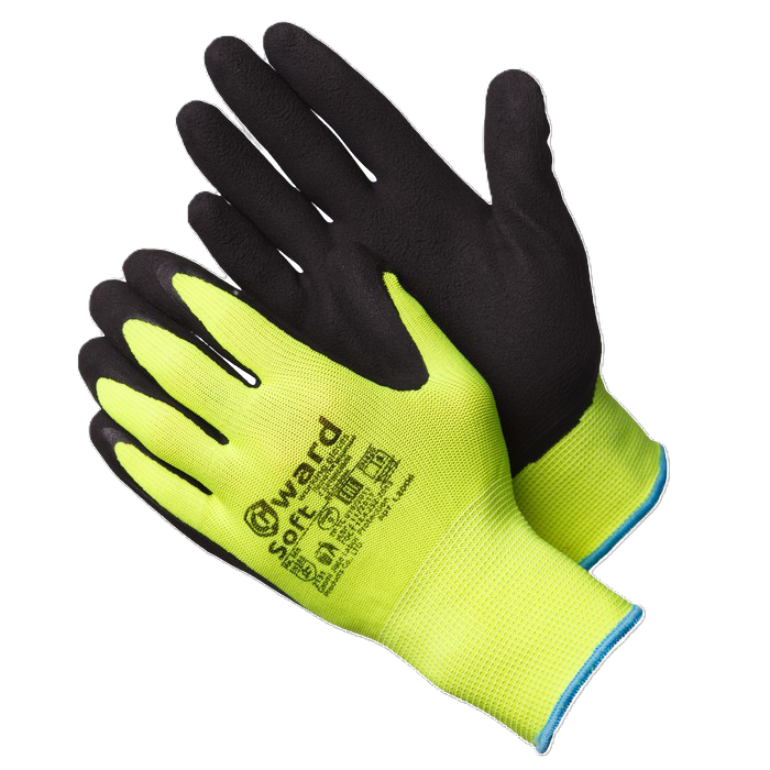 Перчатки Gward Soft выполнены на основе синтетического (полиэстер-нейлонового) трикотажа яркой расцветки (Hi-Vis) с бесшовной структурой 13-го класса вязки. Материал основы обеспечивает активную циркуляцию воздуха и исключает образование ворса. Модель относится к категории универсальных и подходит для широкого спектра механизированных работ. Фиксация на запястье реализована посредством двойного оверлока, усиленного латексным кольцом, что гарантирует надежное удержание перчатки на руке в процессе работы.Особенности пенолатексного покрытия