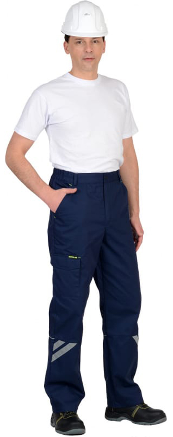 Летние рабочие брюки с притачным поясом с эластичной лентой по боковым швам, застегивающимся на пуговицу, со шлевками, с застежкой гульфика на молнию, с различными функциональными карманами, с элементами из СВ канта и СОП, обеспечивающие безопасность работы в условиях пониженной видимости.
