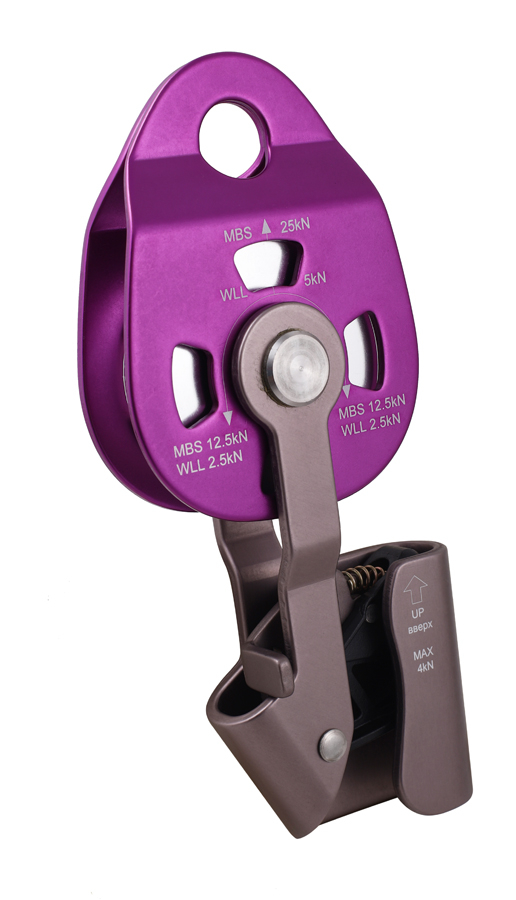 - Допускается использование в качестве блок-зажима и простого ролика. Применяется с текстильными канатами. Зажим вращается вокруг оси ролика, что позволяет вытягивать веревку под любым углом;