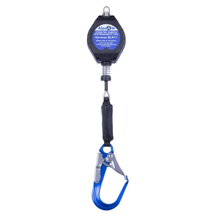 Средство индивидуальной защиты от падения с высоты втягивающего типа (блокирующее устройство) с функцией самоблокировки и автоматическим средством натяжения и возврата втягивающегося троса. Представляет собой соединительно-амортизирующую подсистему и применяется для соединения страховочной привязи с анкерным устройством.