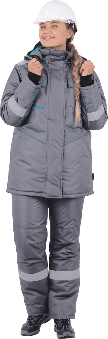 В костюме используются световозвращающая полоса (СОП), кант бирюзового цвета.