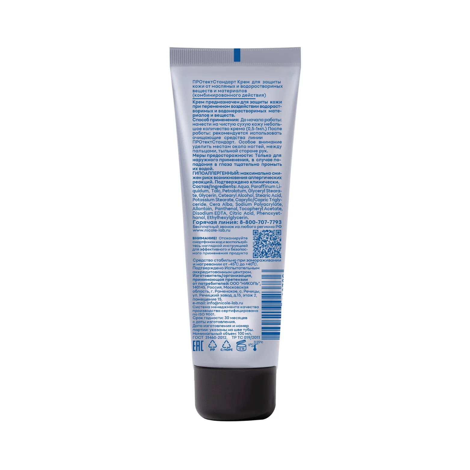 Крем комбинированного действия обеспечивает надежную барьерную защиту кожных покровов при работе с различными материалами, включая водорастворимые и водоотталкивающие вещества. Формула создает эффективный защитный барьер против масляных составов и водных растворов, предотвращая их проникновение в кожу. Клинически подтвержденная гипоаллергенная рецептура не содержит силиконов, парабенов и искусственных красителей, что делает средство безопасным для регулярного применения. Аккредитованный испытательный центр засвидетельствовал сохранение защитных свойств и стабильности состава при экстремальных температурах от -45°С до +40°С, а также присвоил продукции первую категорию эффективности.Сферы применения: