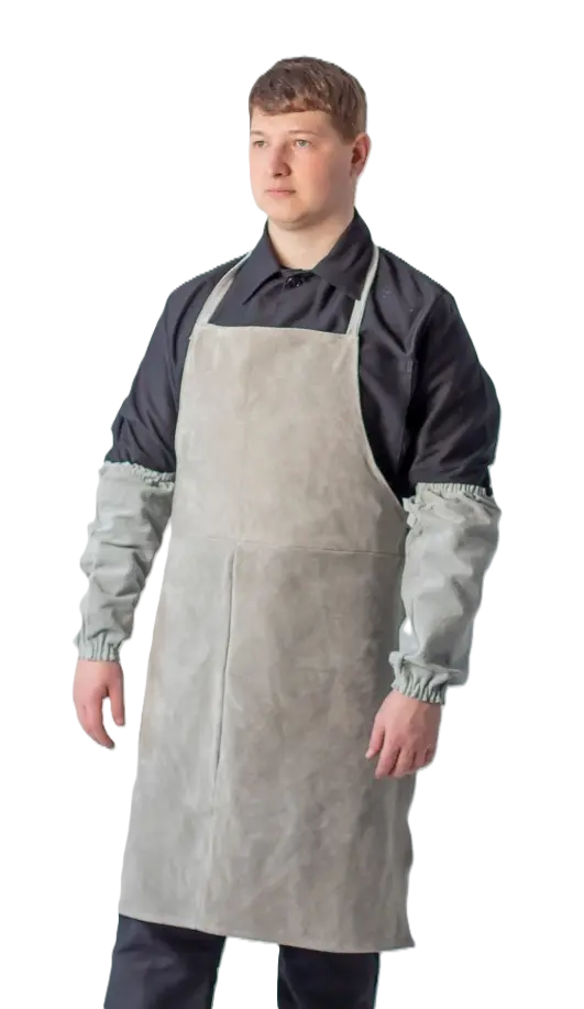 Защитный фартук из спилковой кожи с нагрудной частью, обеспечивающий защиту от искр и брызг жидкого металла.Характеристики: