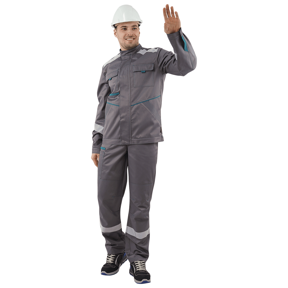 В костюме используется световозвращающая полоса 50 мм на полочке, спинке, рукавах куртки и по низу полукомбинезона. Контрастные отделочные строчки бирюзового цвета.