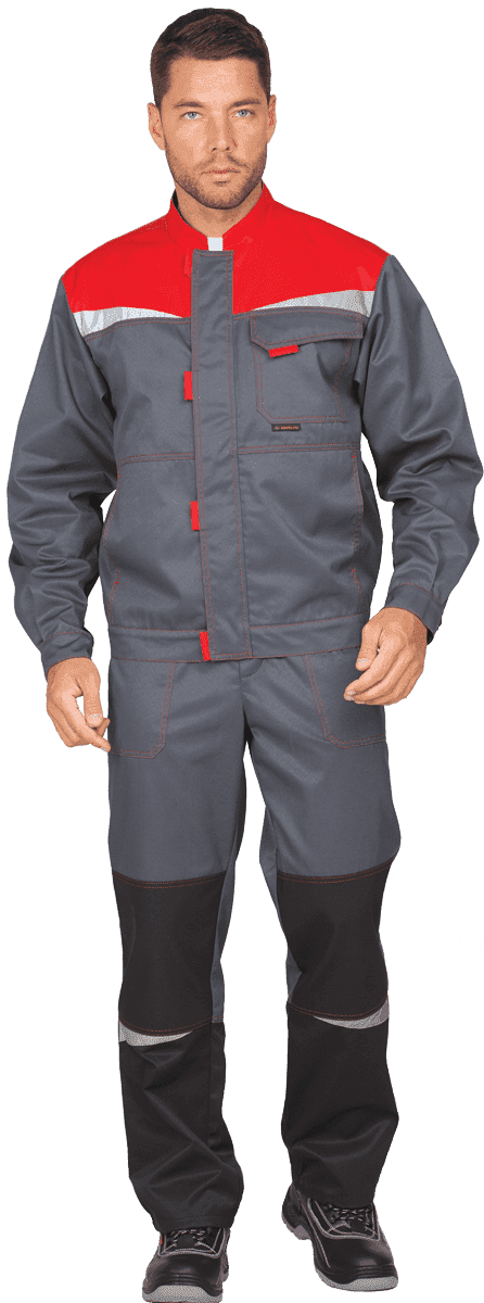 Костюм защитный рабочий летний КМ-10 ЛЮКС, серо-красно-черный (куртка+полукомбинезон)