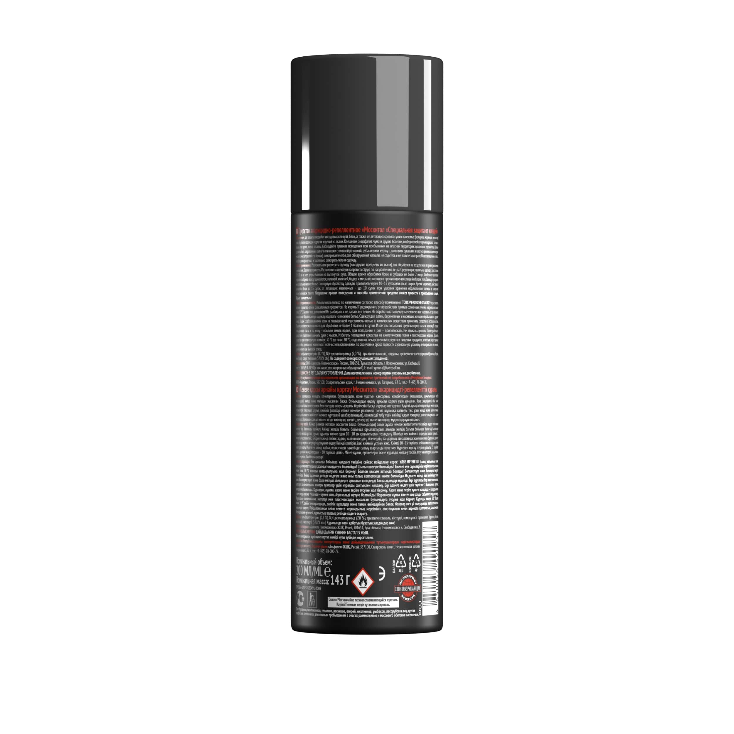 необходимо разложить или развесить одежду на открытом воздухе или в хорошо проветриваемом помещении, после чего встряхнуть баллон и распылить состав с расстояния 20-25 см, направляя струю по движению ветра. Обработку следует проводить, добиваясь легкого увлажнения поверхности, с особым вниманием к зонам вокруг щиколоток, коленей, бедер, плечевого пояса и других потенциальных мест проникновения клещей. После полного высыхания обработанную одежду надевают на нижнее белье. Для продления защитного действия рекомендуется хранить одежду в полиэтиленовом пакете, а повторную обработку проводить через 10-15 суток или после стирки.Состав: