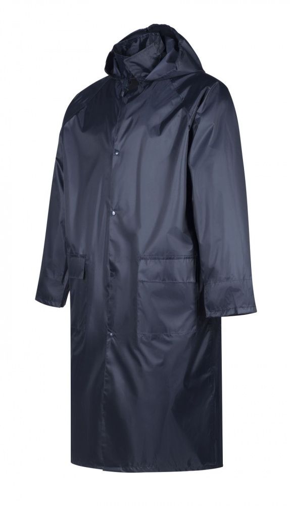 Плащ изготовлен из водоотталкивающего материала на основе усиленного полиэстера ПВХ (толщина 0,18 мм), все швы проклеены ПВХ-лентой для дополнительной герметичности. Модель выполнена в темно-синем цвете и оснащена съемным капюшоном, который скрывается в воротнике на молнии. Для улучшенной вентиляции предусмотрены перфорированные отверстия под рукавами и на спинке, защищенные сеткой.Застежка выполнена в виде двойного ряда кнопок с дополнительной планкой, что обеспечивает повышенную надежность по сравнению с молнией — даже при повреждении нескольких кнопок плащ остается функциональным. Рукава дополнены муфтами для удобства, а два внешних кармана закрываются клапанами.