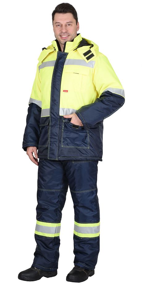 Мужской зимний рабочий костюм состоит из куртки и полукомбинезона. В костюме используются световозвращающие полосы 50 мм.
