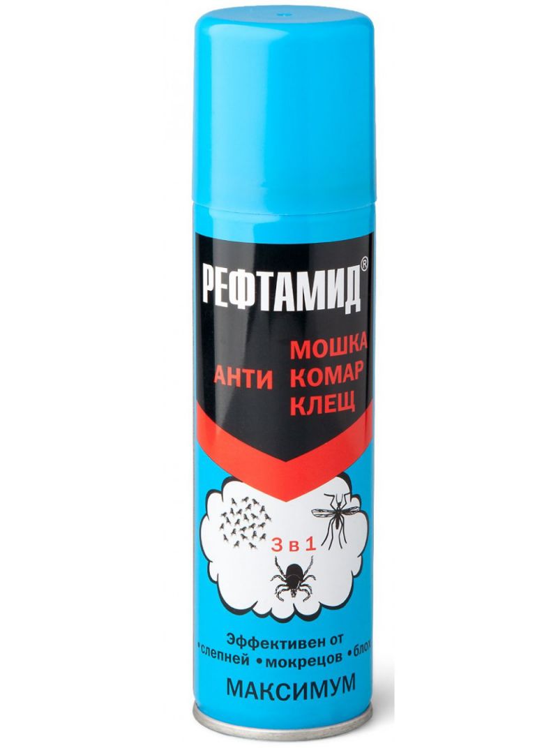 Репеллент "Рефтамид Максимум" – эффективная защита от кровососущих насекомых и клещей.Препарат "Рефтамид Максимум" разработан для надежной защиты человека от укусов комаров, мошек, мокрецов, москитов, слепней, блох, а также таежных и лесных клещей. Средство наносится на открытые участки кожи, одежду, текстильные изделия, сетки, занавеси и другие тканевые поверхности.