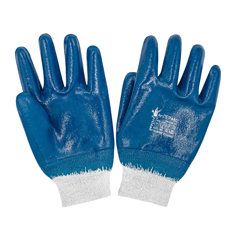 Модель ПЕР 440 представляет собой трикотажные перчатки с усиленной защитой: изделие имеет сплошное двухслойное нитриловое покрытие синего цвета. В зоне запястья предусмотрен трикотажный манжет эластичной фиксации. Общая длина изделия составляет от 260 до 270 мм.Защитные характеристики