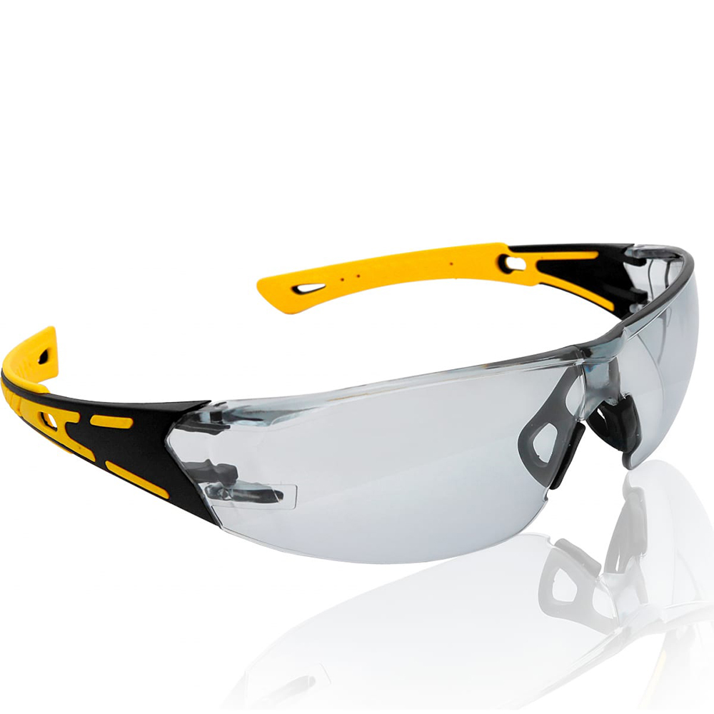 Защитные очки последнего поколения с двухцветными мягкими дужками, сделанными с применением инновационного материала ТЭП (термоэластопласт), с панорамными линзами, которые обеспечивают улучшенный обзор и защищают глаза от попадания летящих частиц.