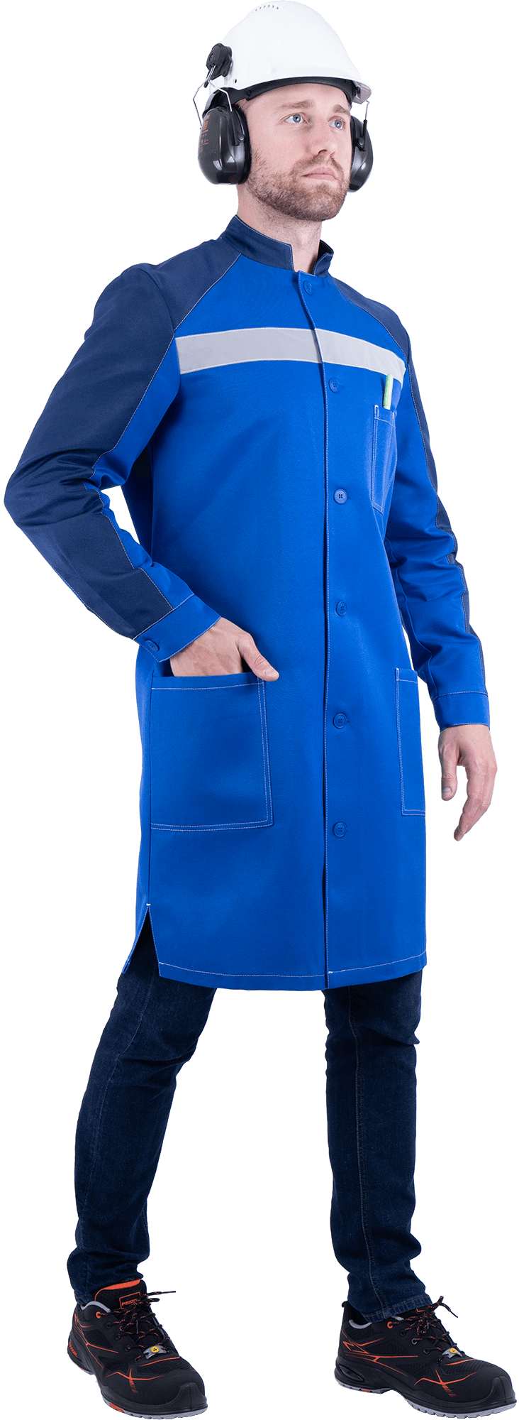 Мужской рабочий халат со светоотражающими полосами (СОП).Особенности