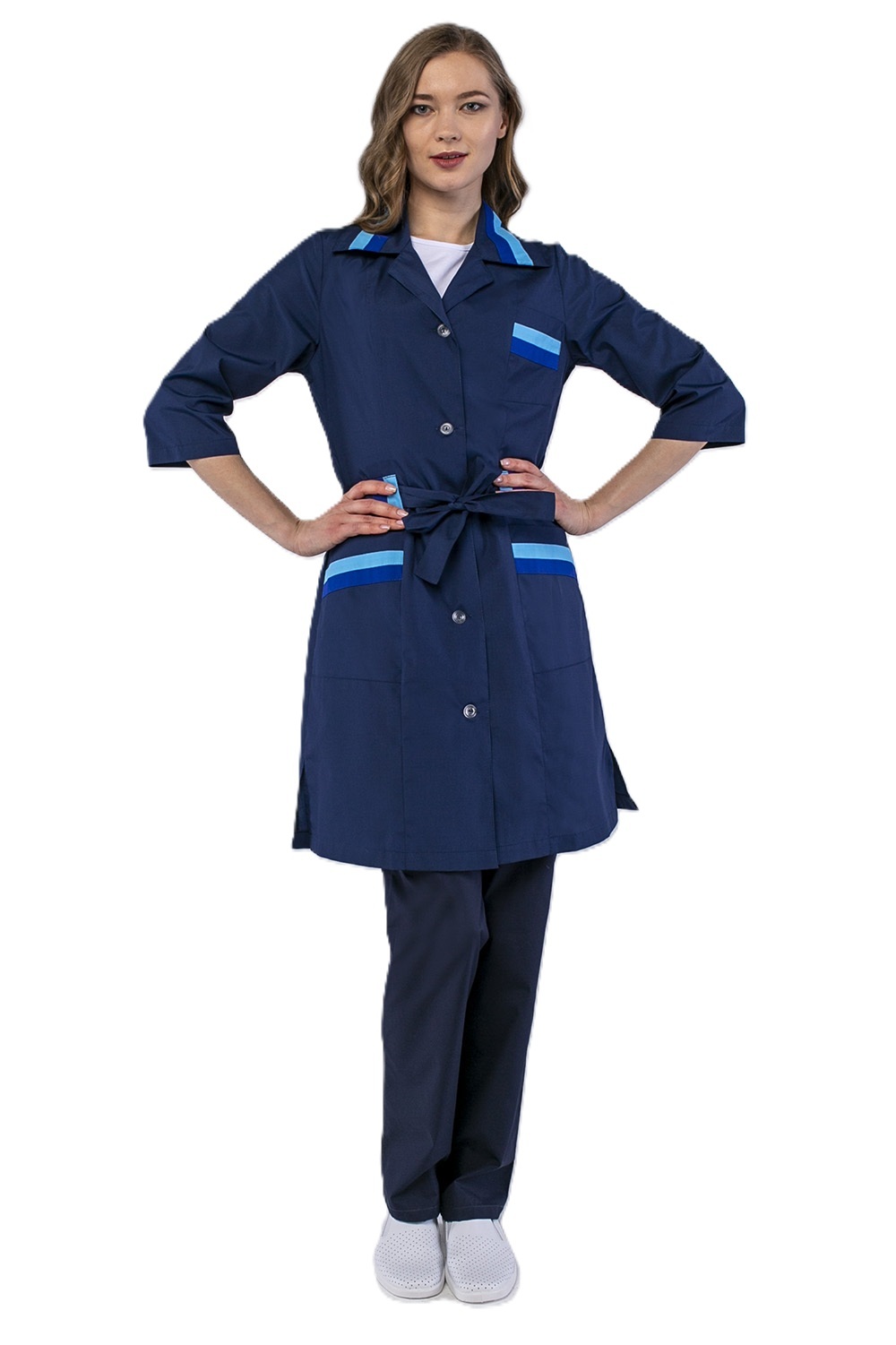 Модель представляет собой практичный вариант спецодежды немаркого типа, разработанный для работниц пищевой и легкой промышленности, сферы обслуживания. Изготовлен из современной смесовой ткани (65% полиэстер, 35% хлопок) плотностью 120 г/м² с влагоотталкивающей пропиткой, что обеспечивает устойчивость к загрязнениям, износостойкость и комфорт в носке при сохранении легкости материала.Дизайн халата сочетает функциональность и эстетику: