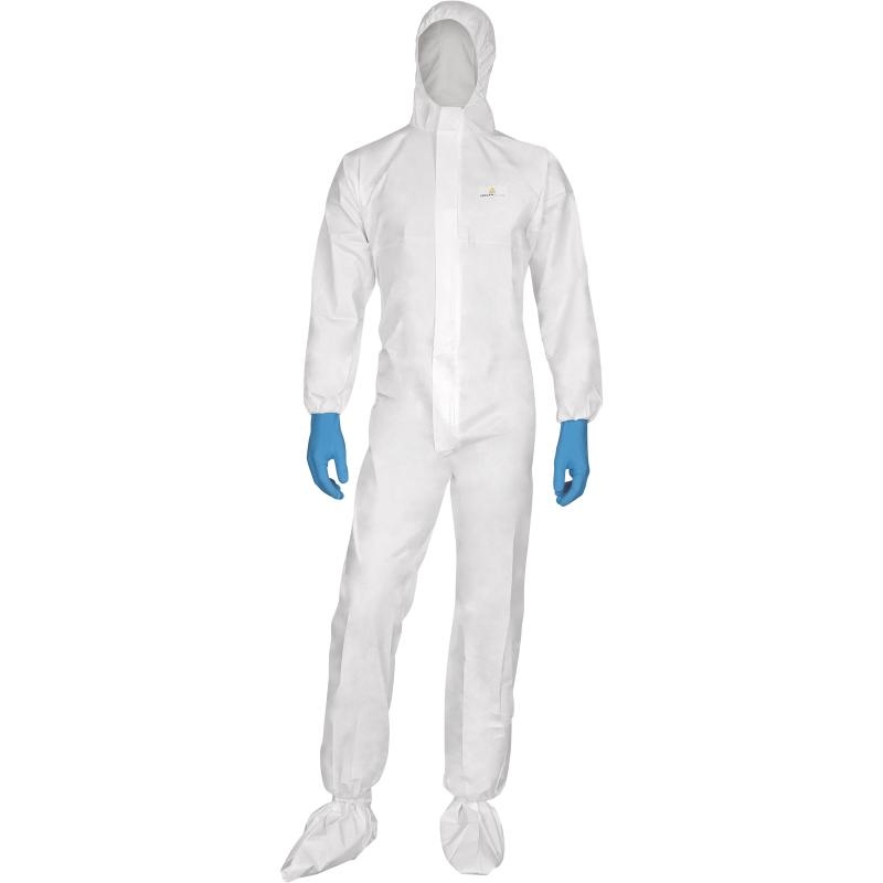 Комбинезон изготовлен из нетканого микропористого и ламинированного материала Deltatek 5000 (70% полипропилен, 30% полиэтилен).Особенности