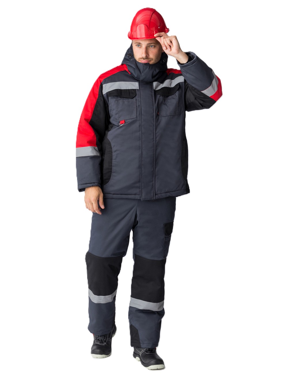 Костюм зимний рабочий ФАВОРИТ-МЕГА, куртка дл. + п/комб, цвет т. серый с черным и красным