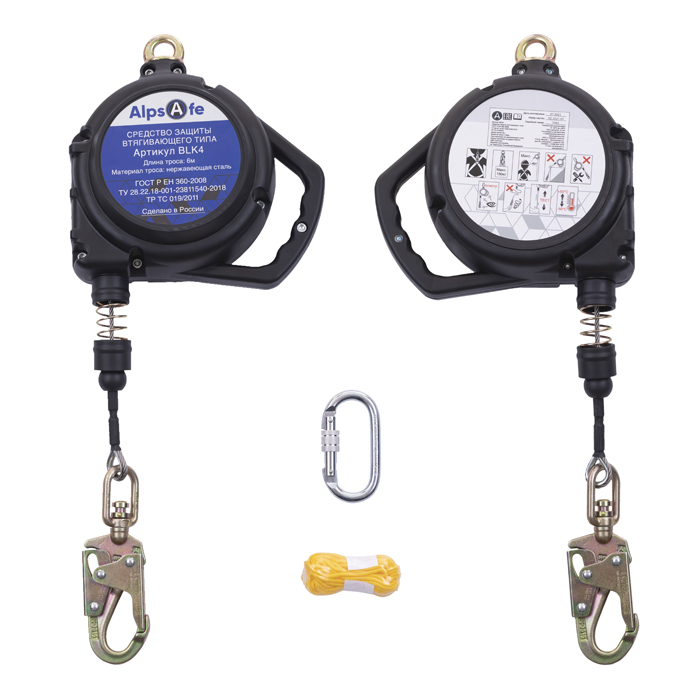 Средство индивидуальной защиты от падения с высоты втягивающего типа (блокирующее устройство) с функцией самоблокировки и автоматическим средством натяжения и возврата втягивающегося троса. Представляет собой соединительно-амортизирующую подсистему и применяется для соединения страховочной привязи с анкерным устройством.